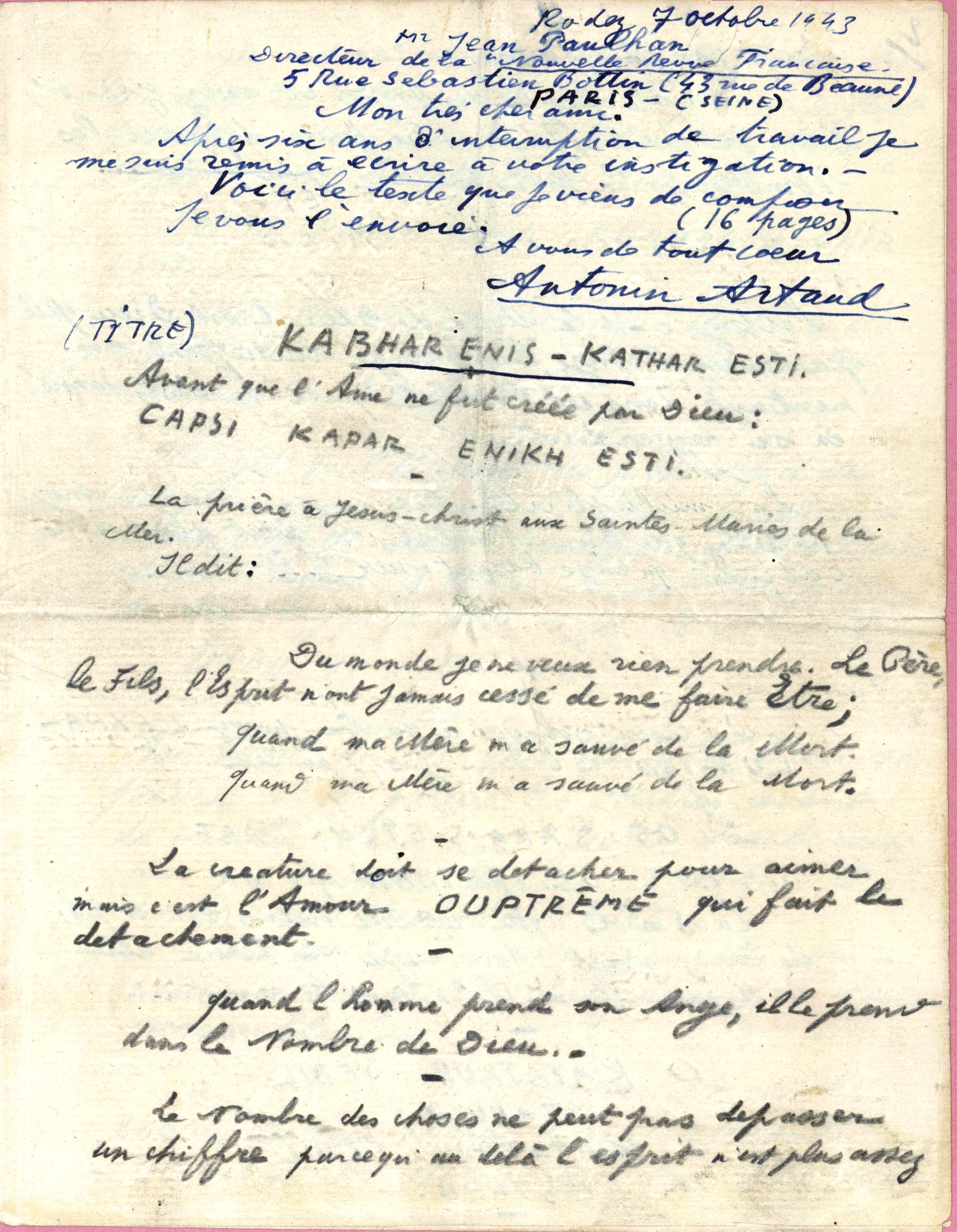 La journée du samedi 23 sera consacrée à des interventions autour de l’oeuvre achetée par les archives départementales, oeuvre inédite financée par le Conseil Départemental, intitulée: »Kabhar Enis-Kathar Esti ». Il s’agit de la première oeuvre écrite par Artaud, quelques mois après son arrivée rue Paraire à Rodez, après 6 ans d’internements et d’interruption de son travail littéraire.